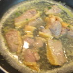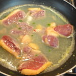 - Dopo 1 minuto scolare le verdure che metterete insieme alle patate, conservando il brodo nel quale cuocere il petto di anatra tagliato a fette, far scottare da ambo i lati, lasciare l'interno crudo.( 1 o 2 minuti, dipende dalla grandezza e spessore dei pezzi)