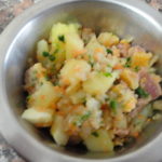 Anatra scottata con patate, carote e finocchi per il mio barbone medio Lothar di 5 anni dal peso di Kg.7,500. La dose di questa ricetta è per due ciotole.