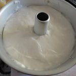 - Dopo aver ben mescolato, versare il composto nello stampo adatto all’angel food cake e passare all’interno una lama di coltello o una spatola di metallo per eliminare eventuali vuoti.