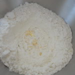 - Mescolare per pochi secondi, la farina e il lievito nel kenwood, vel. 1, fare il pozzo nel centro con un cucchiaio ed aggiungere l' uovo battuto leggermente e mescolare con un po' di farina.