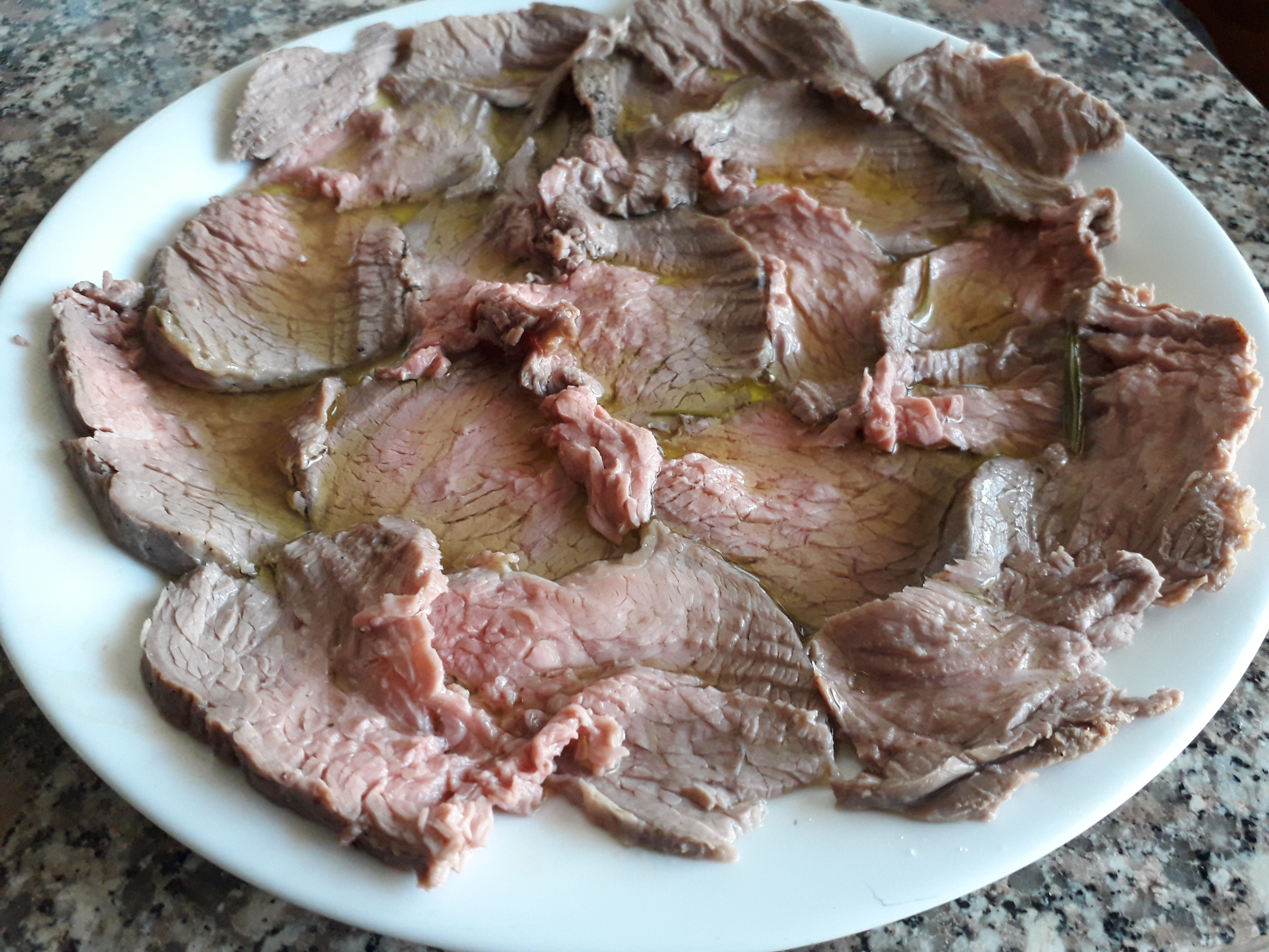 - Ho estratto il pezzo di carne dal vasetto e l'ho tagliato a fettine sottili che ho messo su di un piatto piano.