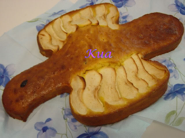 Questa colomba alle mele è stata preparata dall’amica Kua, alla quale non piace la colomba classica e ha pensato, comunque, di onorare la Pasqua con una torta a forma di colomba che ha preparato col fantastico Kenwood Chef.