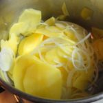 - Tagliare con la mandolina il cipollotto e le patate dopo averle sbucciate, metterle in una casseruola piccola con 1 cucchiaino di olio e cuocere per qualche minuto a fiamma bassa.