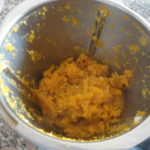 - Mettere nel boccale la zucca, dopo averla sbucciata e tagliata a pezzetti, (ho utilizzato la zucca lunga di Napoli molto asciutta e soda), tritare: 5 sec. / vel.5.