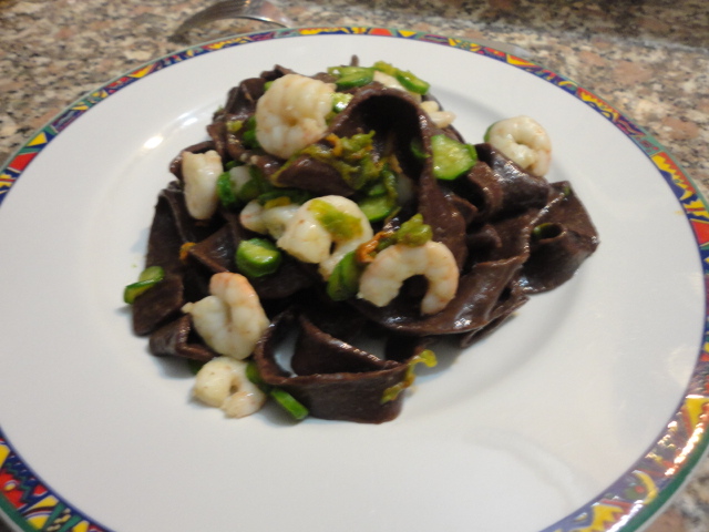 Fettuccine al cacao con zucchine e gamberetti
