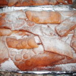 L’impasto delle chiacchiere è a base di farina e uova, e le chiacchiere sono a forma di striscia sottile dai bordi seghettati, fritte in olio bollente o cotte al forno.