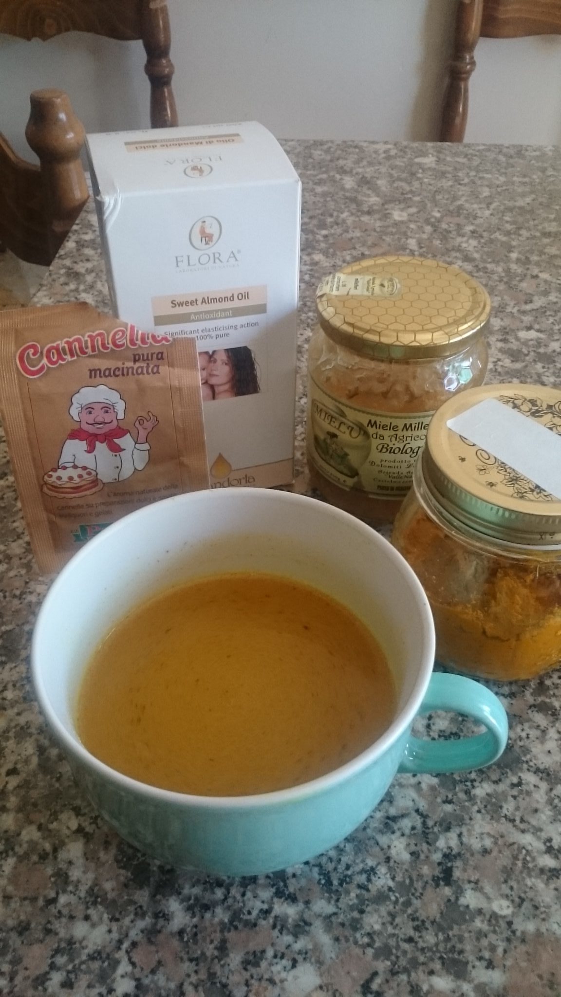 - Spegnere subito, versare in tazza e aggiungere il miele di acacia o millefiori, l'olio di mandorle dolci per uso alimentare oppure il burro chiarificato o l' olio evo e la spolverata di cannella in polvere.