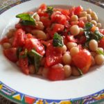 - Mettere in un piatto i fagioli lessati e non salati con un po' della loro acqua (ho cotto i fagioli in precedenza), aggiungere i pomodorini ben lavati ed asciugati, tagliati a pezzetti, l'aglio, l'olio, il basilico spezzettato necessariamente a mano e poi il grano scolato e sciacquato.