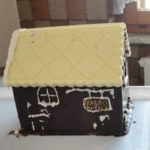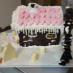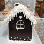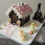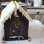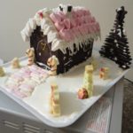 La casetta in questo post è di cioccolato fondente con tetti di cioccolato bianco, decorata con marshmallow, con ghiaccia bianca, immersa in un paesaggio innevato con alberi di cioccolato bianco, dipinti con colori edibili ed un albero grande di cioccolato fondente.