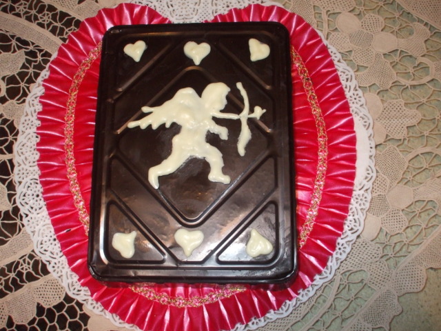La decorazione è un Cupido, disegnato su carta forno e riempito di cioccolato bianco fuso.
