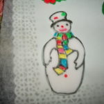 Mi sembrava spoglio il vassoio solo con l’albero, così ho pensato di spalmare del glucosio sulle parti vuote ed ho spolverato con farina di cocco nella parte superiore a simulare la neve, nella parte inferiore farina di cocco colorata di verde con colore gel sciolto nel rum bianco ed acqua, ho incollato poi 2 slitte una rossa ed una blu, il pupazzo di neve, un alberello e delle stelline.