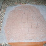 Dopo aver preparato l’impasto per i biscotti e fatto riposare in frigo ho proceduto a stenderlo, ho appoggiato lo schema dell’albero sull’impasto ed ho ritagliato i vari pezzi che ho messo, ricostruendo l’albero, sulla teglia da forno ricoperta di carta forno. La base dell’albero l’ho dovuta mettere da parte, perché sotto non ci entrava.
