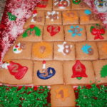 Ecco il progetto del calendario, lo schema è su carta forno e non si vede molto bene. L’albero è costituito da 24 caselle preparate con il pan di zenzero o gingerbread, con decori in cioccolato e pasta di zucchero, alcuni fatti con stampini ed altri a mano.