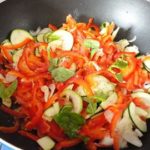 - Tagliare con una mandolina il peperone, la zucchina e il cipollotto.