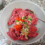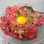 - Mettere in una ciotola la carne trita, aggiungere il basilico spezzettato, il cipollotto, il trito di peperone, sale, pepe, uovo, pecorino e parmigiano.