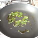 - Spezzettare con le mani il basilico e la menta, io non li trito né con il coltello né con un tritatutto, perché perderebbero di aroma, farli riscaldare nei 2 cucchiai di olio a fiamma molto bassa, non devono soffriggere.