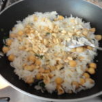 - Versare il riso nel condimento molto profumato, mescolarlo, aggiungere i ceci, le nocciole tritate grossolanamente, il sale e il pepe.