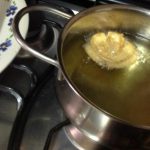 - Riscaldare l'olio di arachide e cuocere, una per volta le roselline, mantenendola ferma sul fondo, con il manico di un cucchiaio di legno.