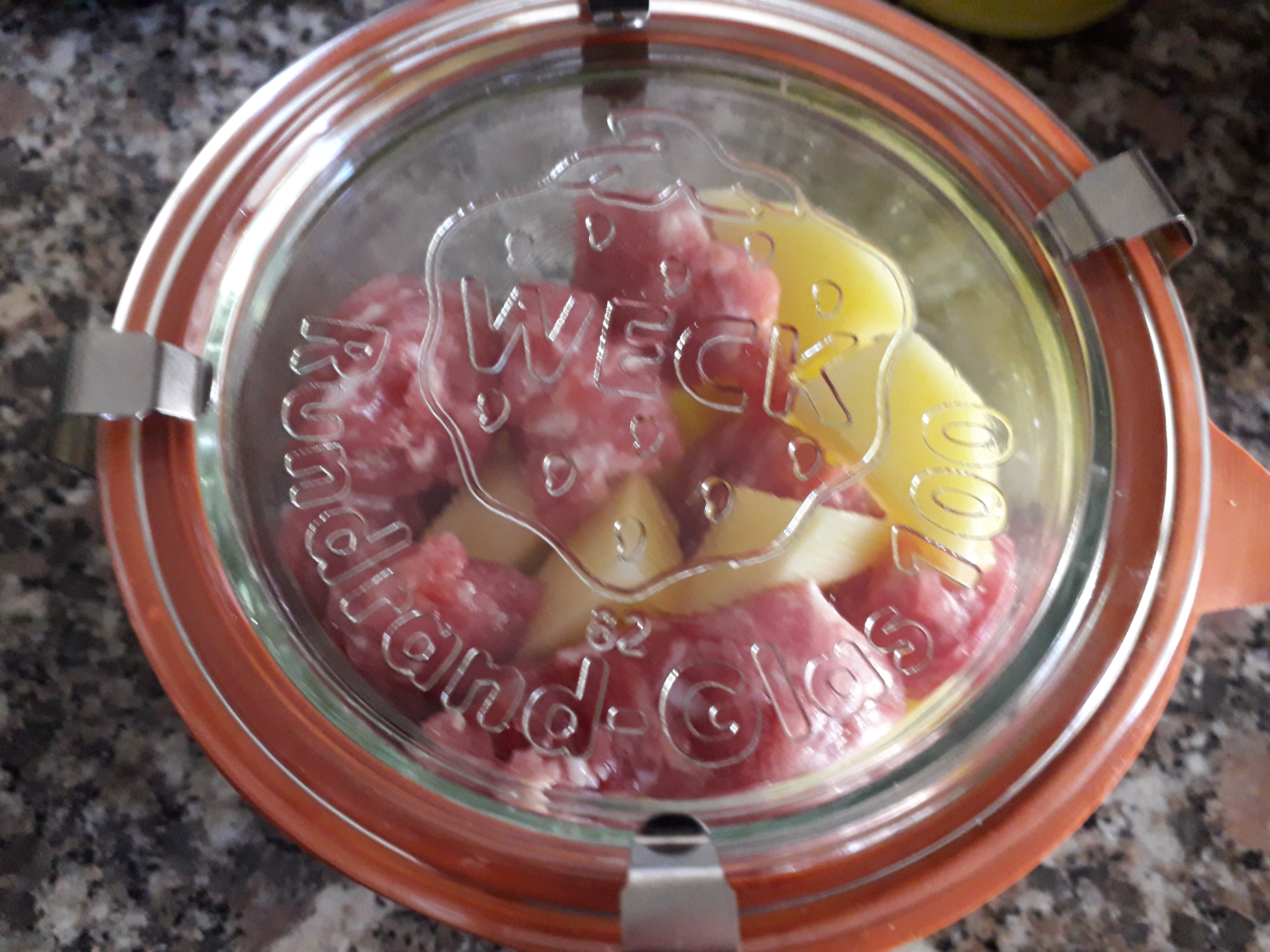 Oggi per il pranzo un bel vasetto di salsiccia e patate in bianco, credetemi si sente un profumino delizioso.