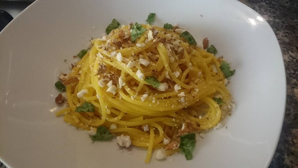 Spaghetti alla curcuma con mandorle e basilico