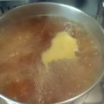 - In una pentola con acqua bollente appena salata, aggiungiamo la curcuma e, in questa acqua, lessiamo gli spaghetti.