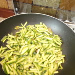 Lavare bene le zucchine e tagliarle a julienne.